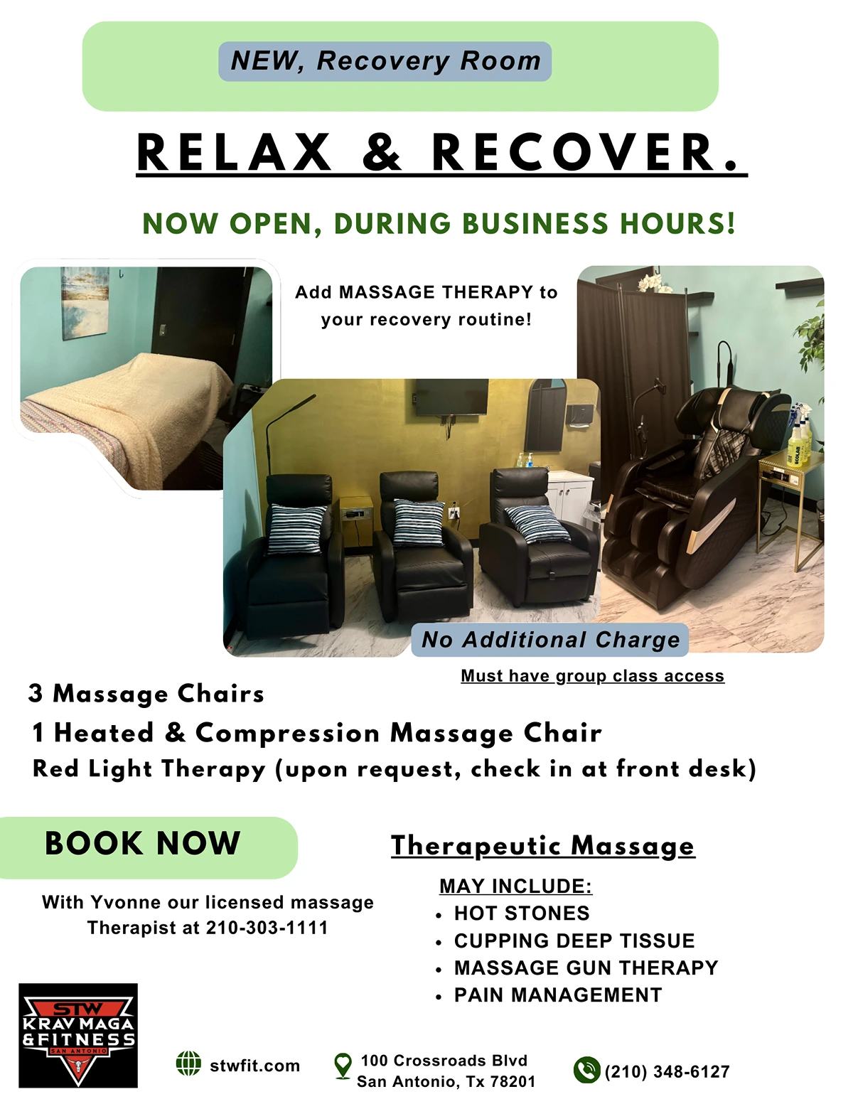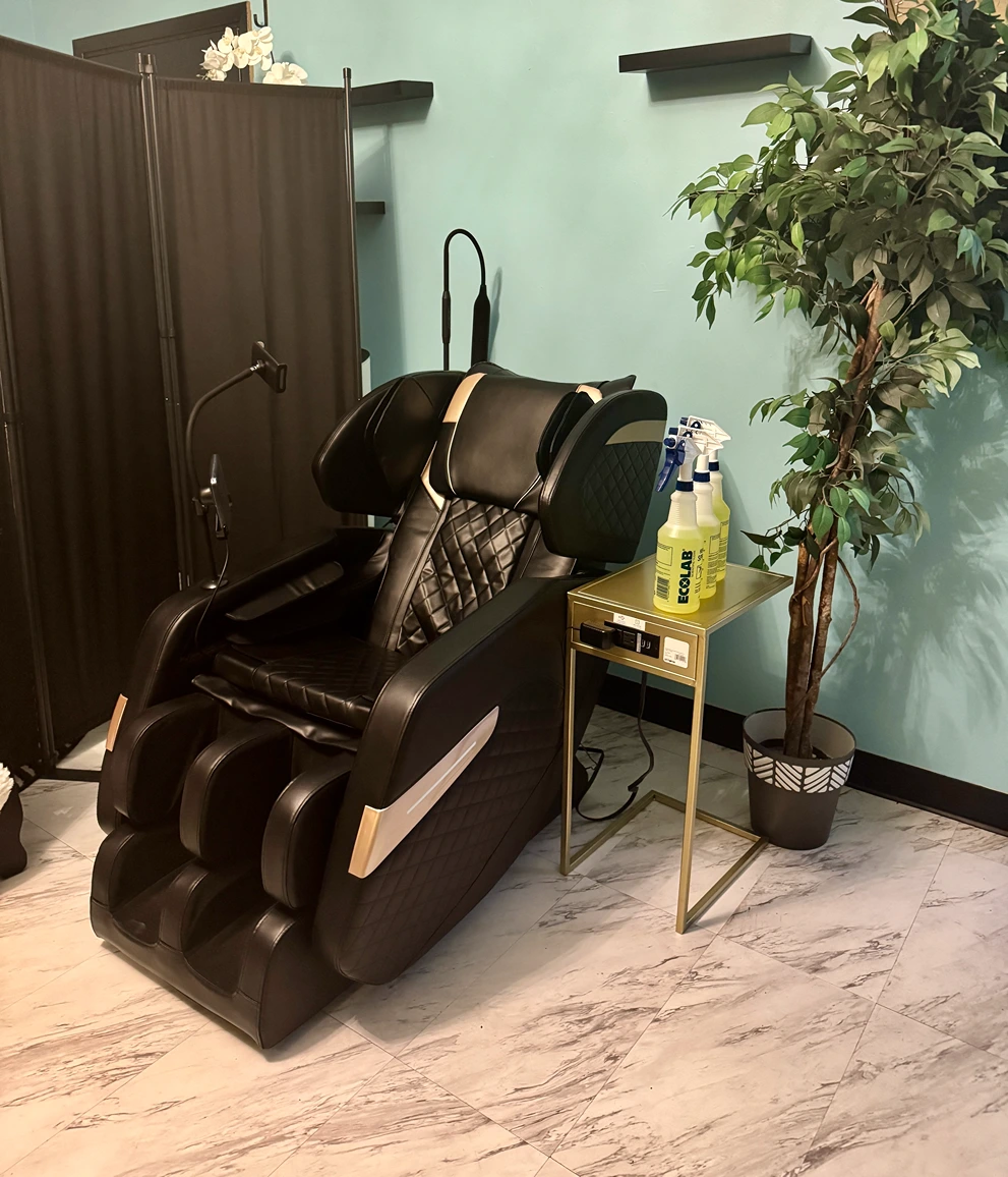 3 Massage chairs, 1 Heated and compression Massage chair, and RED LIGHT THERAPY! (upon request, please check in with front desk)