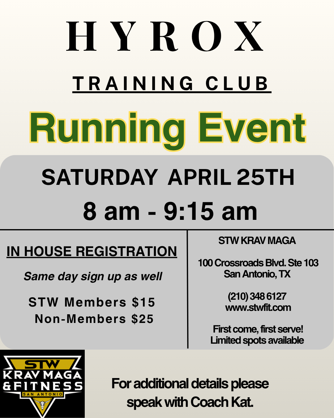 Training will be led by Coach Kat.
